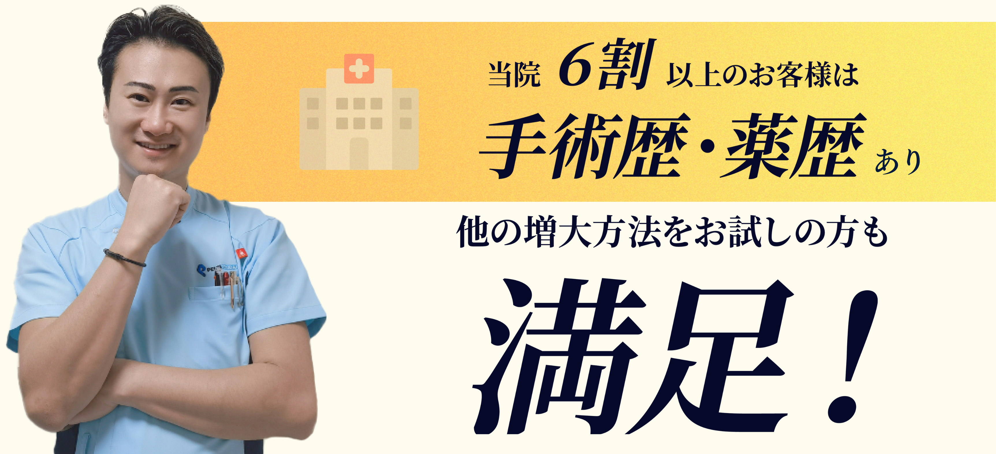 ペニス増大(陰茎の長さ、太さ、亀頭増大)だけを目的とするのではなく、硬さ、持久力、勃起力、中折れ、勃起不全、早漏、頻尿、男性機能低下などの改善と回復も目指します。